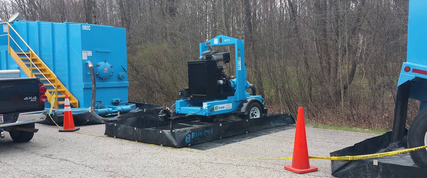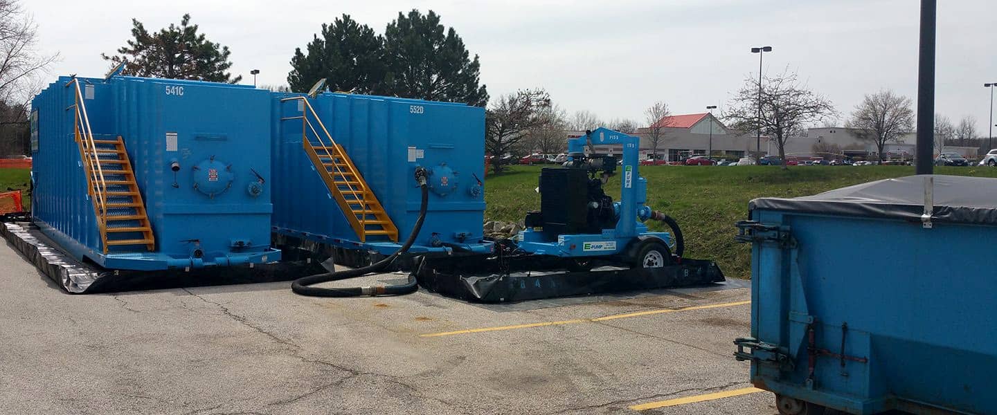E-Tank and E-Pump were called upon to design a custom solution to safely contain and treat the contaminated water, alleviating further environmental and commercial disruption. Three four-inch vacuum-assist, high-flow diesel pumps, along with a two-inch electric submersible pump, were used to move the water from the drainage ditch and retention pond into five 21,000 gallon frac tanks. Spill containment berms were installed to ensure complete containment of the contaminated water during the removal process. The affected water was treated to reduce the pH level. Once the reduction in pH level was accomplished, the water could be discharged into the sanitary sewer.