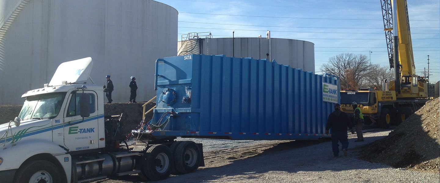 The solution involved placing a frac tank inside a containment dike which required the use of a crane. Because of the complexity of this operation, we had to coordinate closely with the client to schedule the placement amidst the daily routine at the plant. Once in place, the frac tank was needed through the winter months, so E-Tank also installed a submersible pump within to keep the liquid circulating when it was likely to freeze.