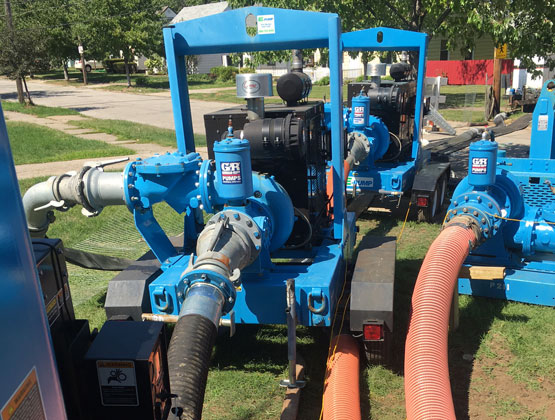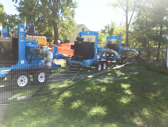 E-Pump’s innovative bypass system deployed a 12” vacuum-assisted rental pump to handle normal flows, along with three standby 10” vacuum-assisted pumps to respond to peak flow should water levels rise quickly. The primary 12” pump was set to operate within a specified water level range and the three 10” emergency backup pumps were set to operate automatically using a common float control.