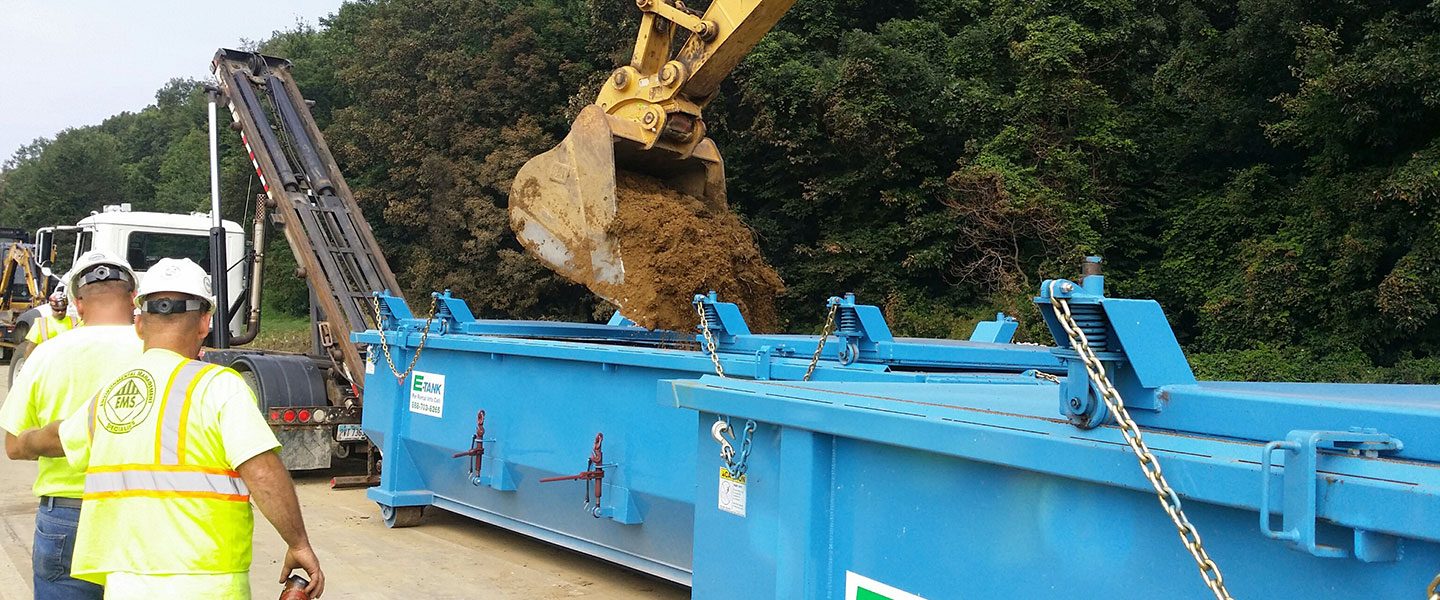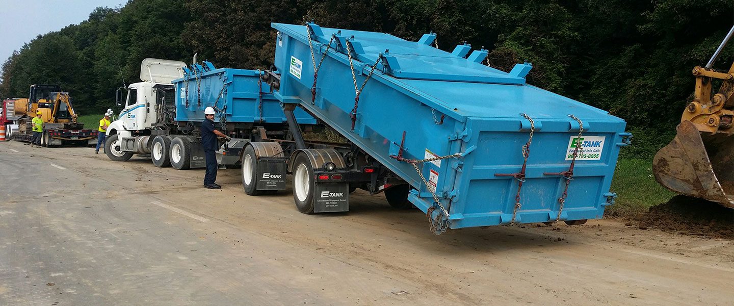 When the emergency response team came on the scene, they called E-Tank for reliable equipment and timely service to aid the clean-up process. Their initial order called for 10 tarp-top sludge boxes to be delivered at 11 AM but subsequently asked for a delay while they managed complex site logistics. Later that evening, they expanded the order to 24 boxes, and E-Tank sprang into action, placing 6 trucks on the job, delivering roll-offs until 2 AM. The following morning, the response team needed yet another 12 roll-offs; E-Tank’s staff and trucks got moving immediately and had the additional equipment on site within hours.